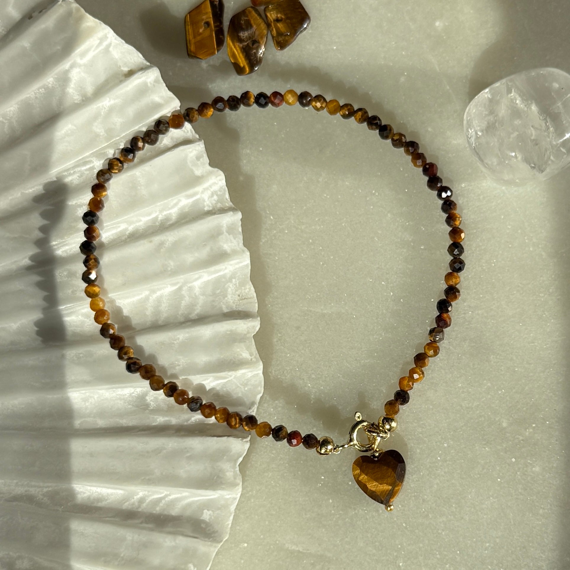 Natural Tiger Eye Heart Charm Gemstone Beaded Bracelet is crafted by hand using natural gemstones and premium 14k gold plated 925 sterling silver.