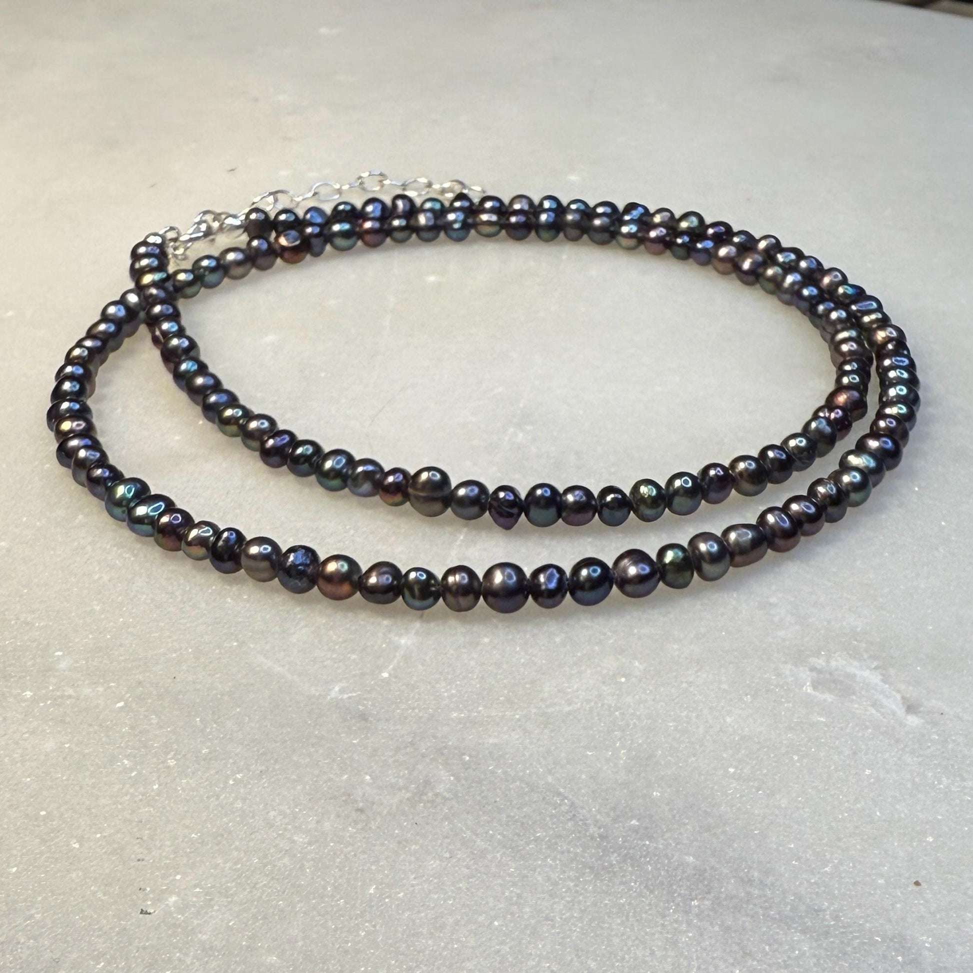 Dainty Natural Pearl Beaded Choker Necklace is crafted by hand using genuine freshwater pearl black peacock beads (4mm) and premium 925 sterling silver.