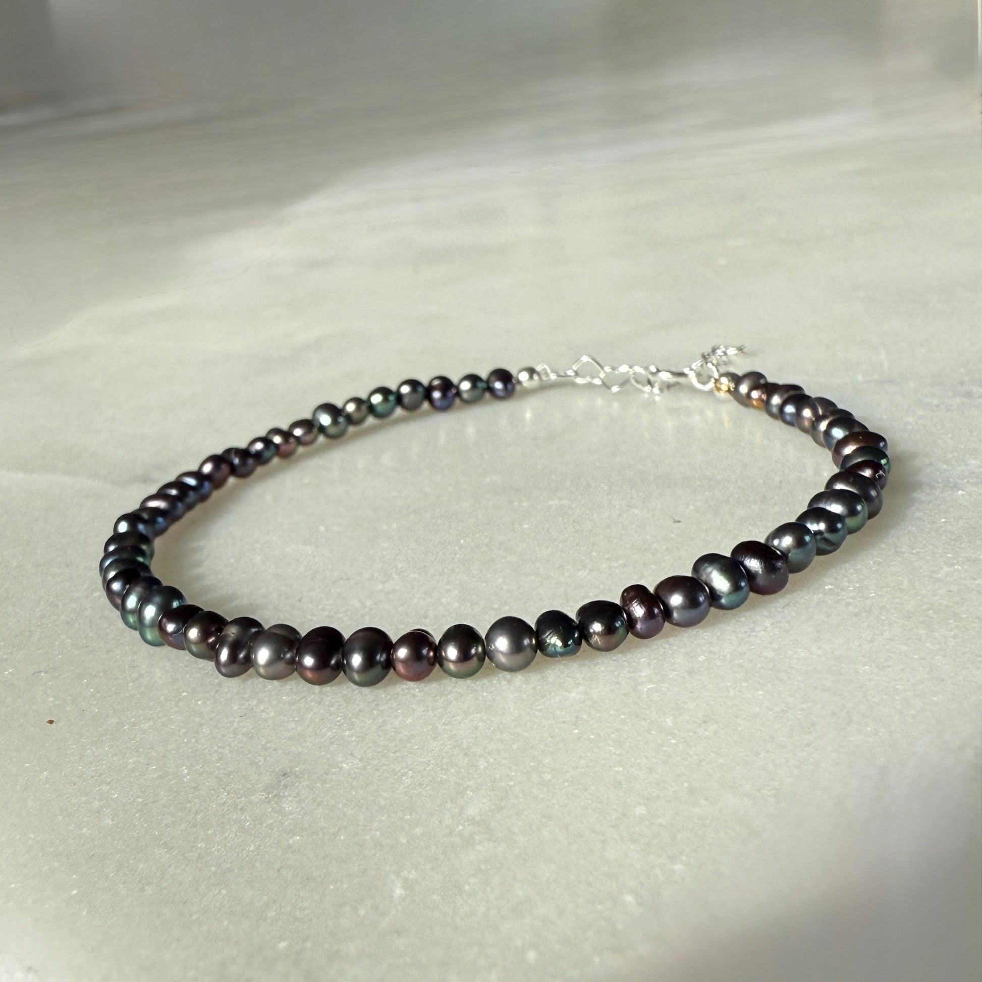Natural Pearl Beaded Bracelet is crafted by hand using genuine freshwater pearl black peacock beads (4mm) and premium 925 sterling silver.