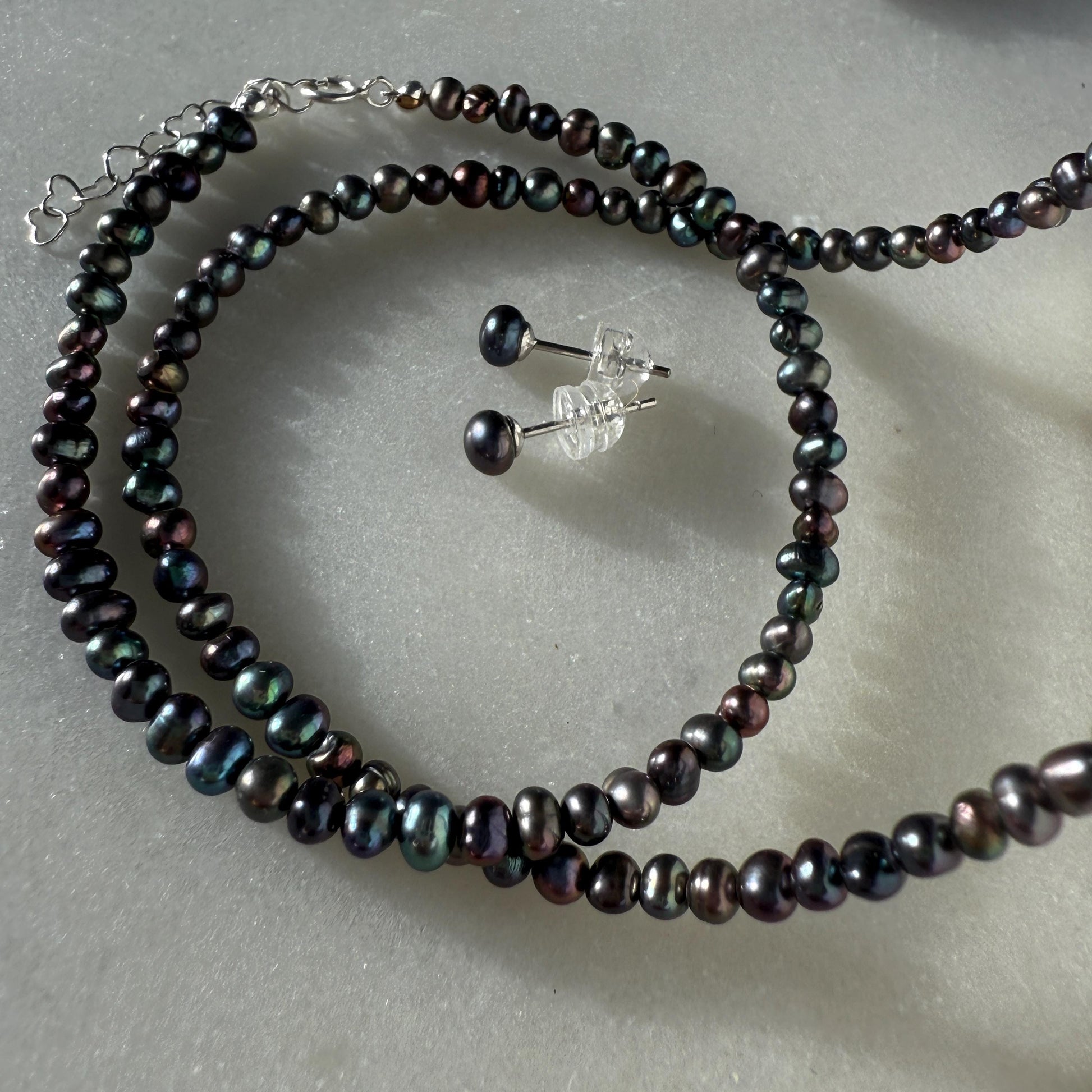 Natural Pearl Stud Earrings are crafted by hand using genuine freshwater pearl (black peacock, 5.5 mm) and premium 925 sterling silver.